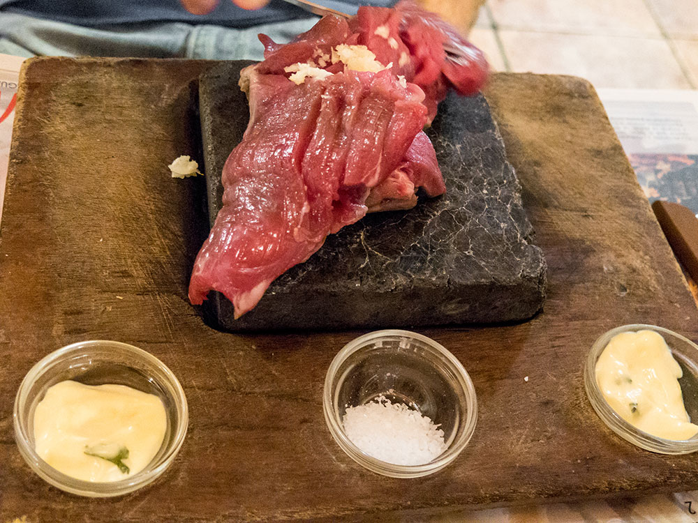 Nosotros pedimos para tres, pargo a la brasa, pulpo a la brasa y naco de lomo, este último a la piedra. Todos los platos fueron servidos con abundante guarnición vegetal de verduras y patatas.